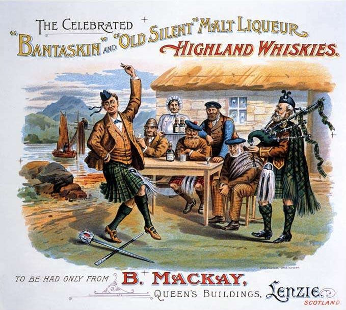 "The Celebrated 'Bantaskin' and 'Old Silent' Malt Liqueur Highland Whiskies" vintage advertisement with a sword dance!