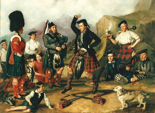 "The Sword Dance" by David Cunliffe 1853. The 93rd Regt (Sutherland Highlanders) are wearing a range of tartans. The dancer, Bandsman MacKenzie, is wearing the 42nd Band tartan.